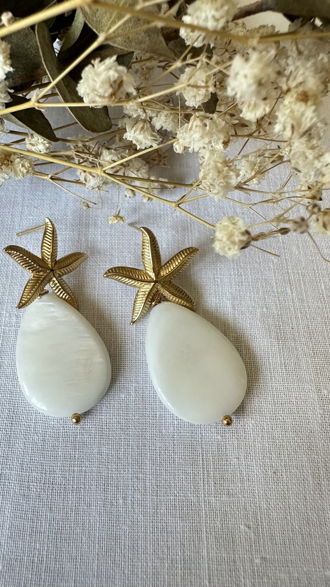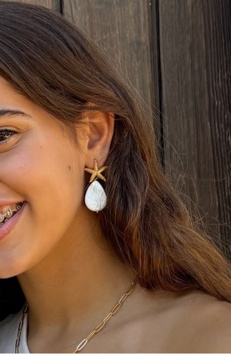 Com estrela-do-mar dourada no topo e uma gota de madrepérola que parece ter sido pescada no fundo de um sonho, estes brincos trazem a vibe certa — entre o cool escandinavo e o calor italiano.