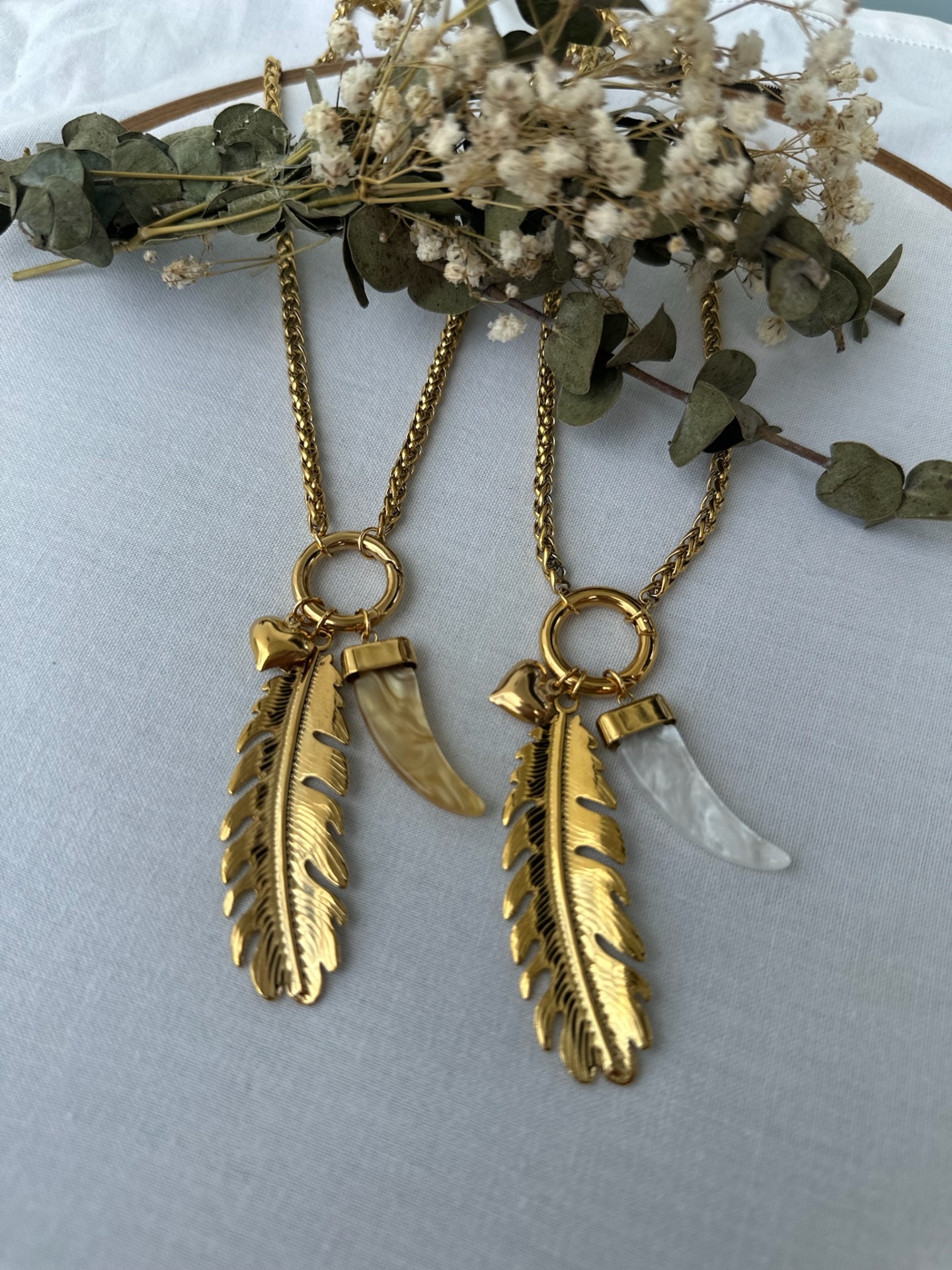 O colar Aurora junta uma corrente dourada com pendentes que fazem toda a diferença: uma pena fina, um dente de resina com brilho suave e um mini coração dourado — porque o detalhe importa.