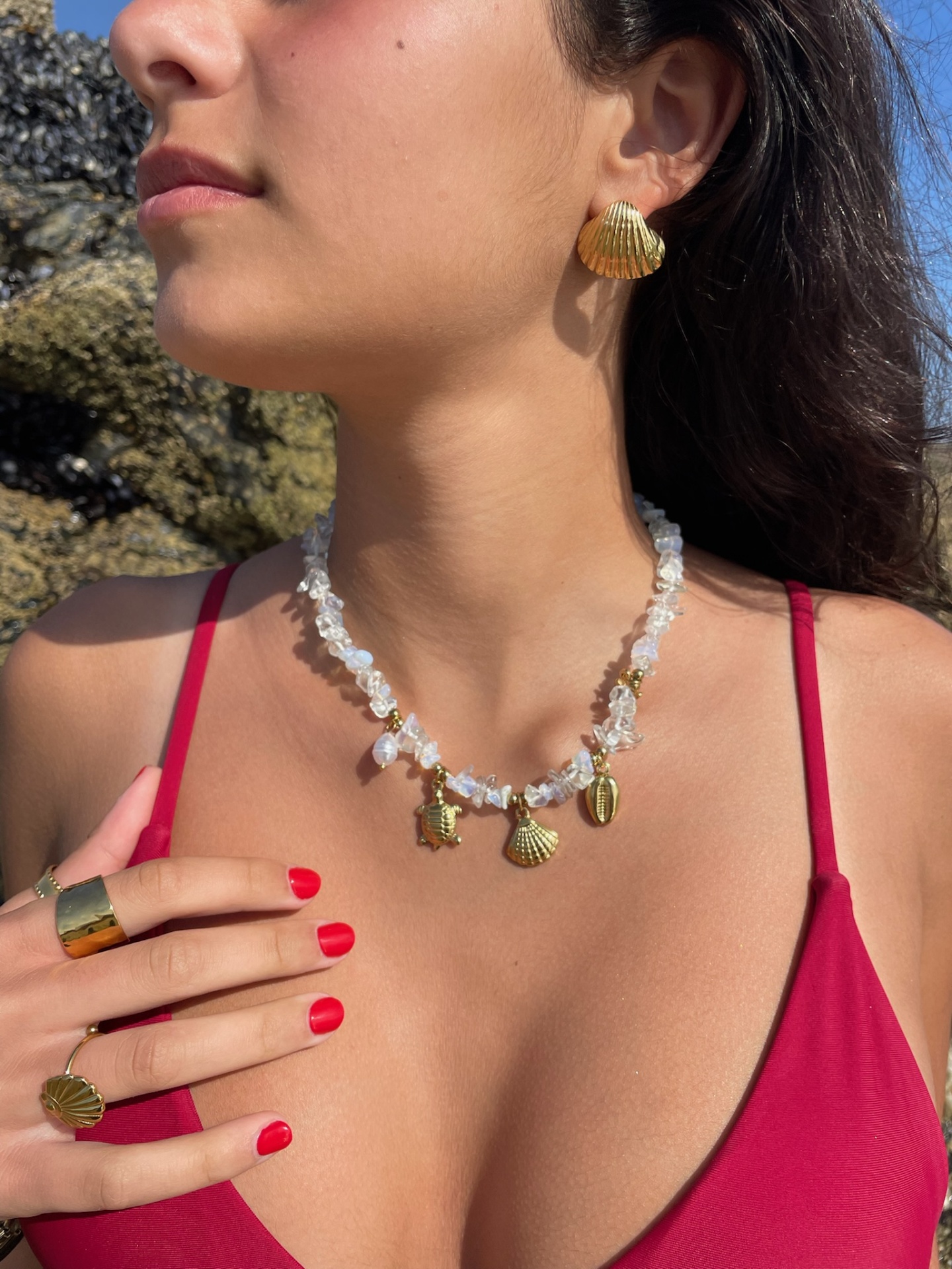 Como a brisa do mar que te arrepia a pele e te deixa leve. O colar Brisa Salgada combina pedrinhas translúcidas com pendentes dourados de conchas e tartaruga, criando um look fresco, delicado e cheio de energia solar.