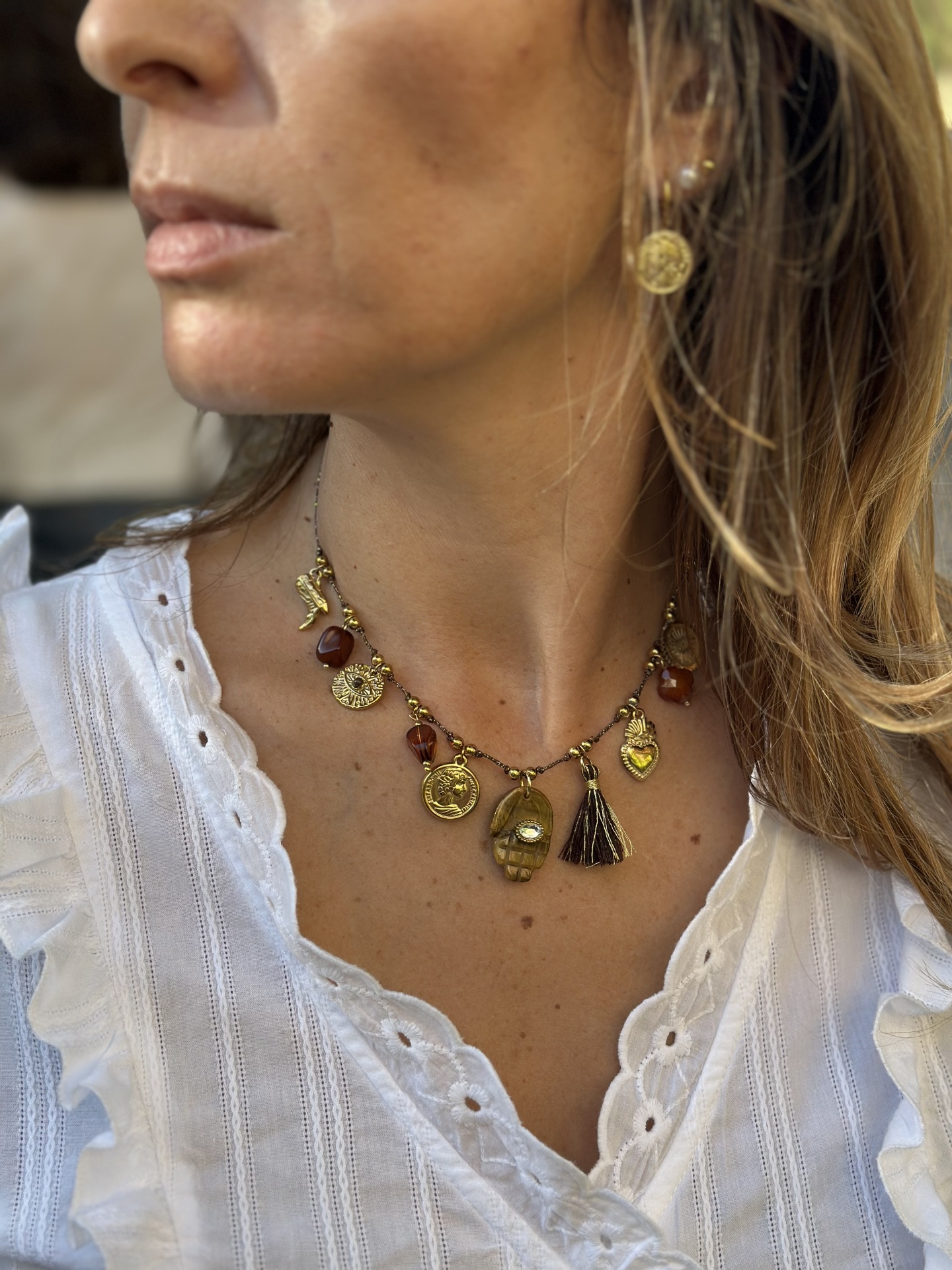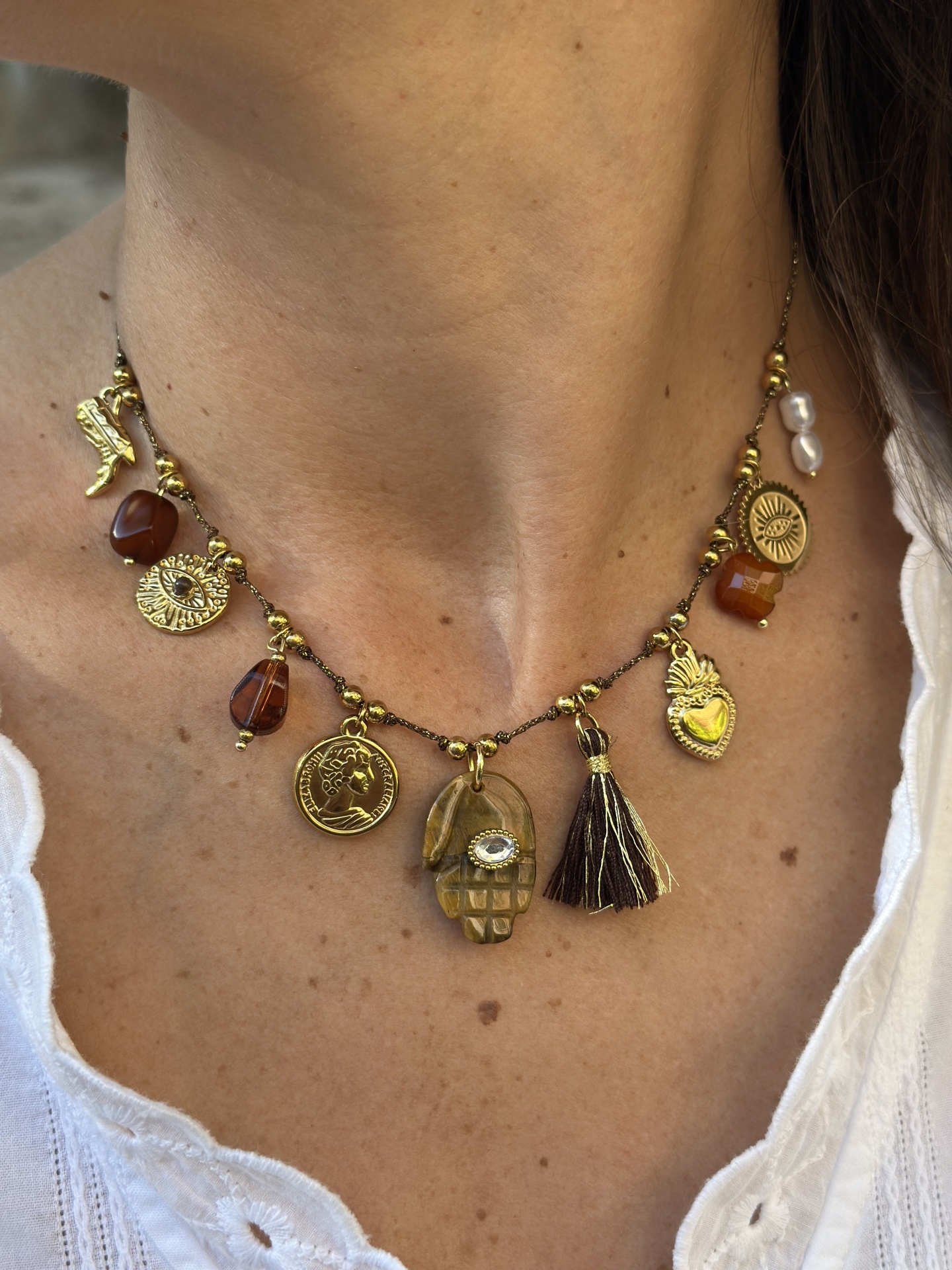 Com amuletos dourados, olho protetor, pérolas e toques boho super atuais, este colar traz uma vibe leve e espontânea, como um raio de luz que acompanha o teu dia.