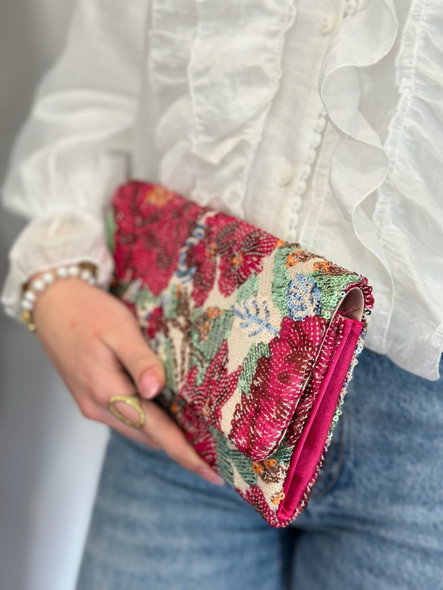 A Julieta é pura poesia em forma de clutch. Com um padrão floral bordado, cores vibrantes e um acabamento rico em textura, esta mala junta o encanto do vintage à originalidade do feito à mão.