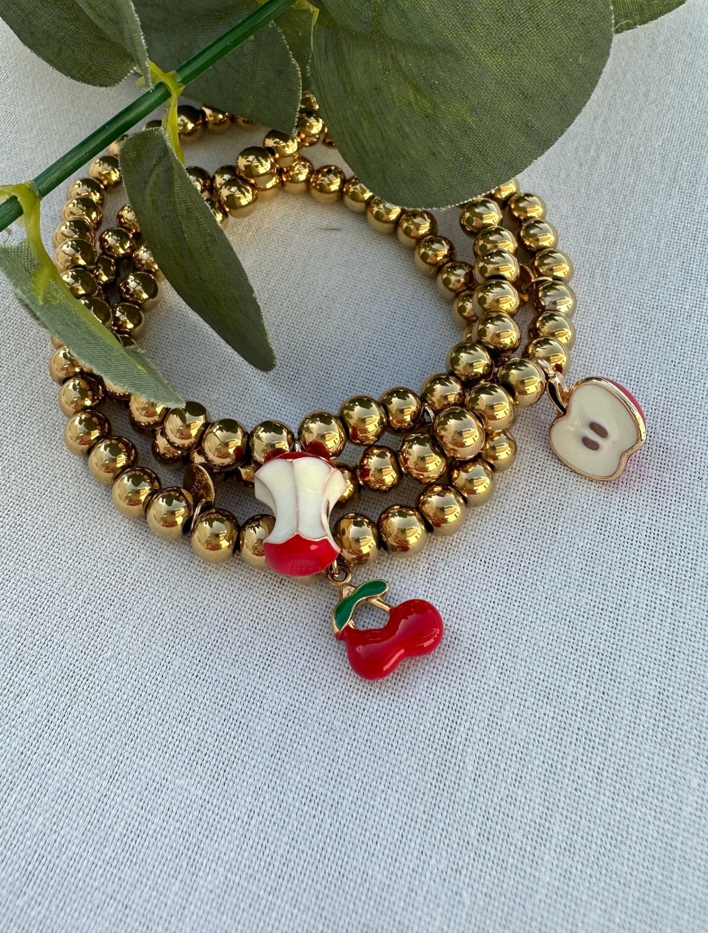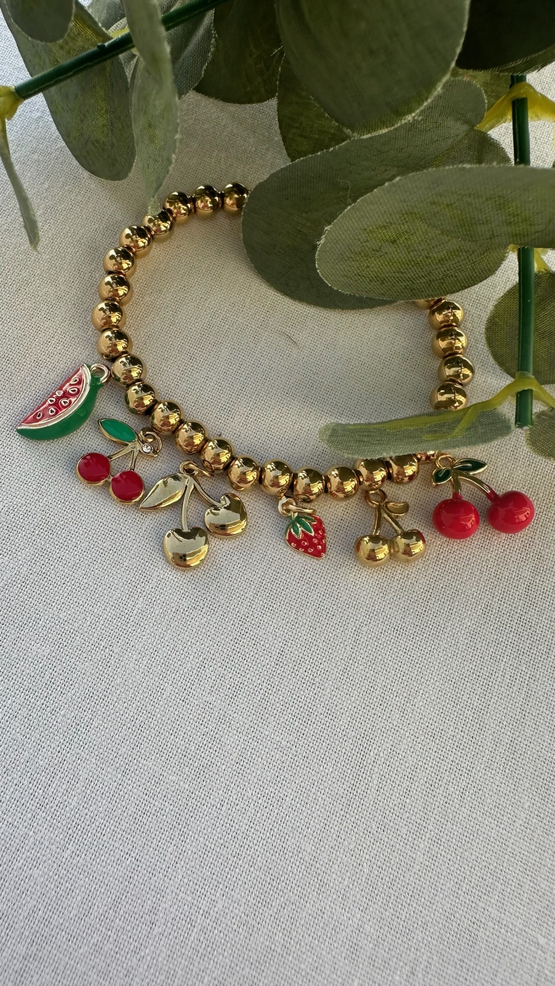 Sol, cor e brilho! A pulseira Frutas de Verão traz aquele toque divertido que combina com dias leves e cheios de estilo. Feita com bolinhas de aço dourado, ela é resistente, confortável e super charmosa. O destaque vai para o pingente esmaltado, que podes escolher: maçã mordida, fatia de maçã, fatia de melancia ou cereja 🍒