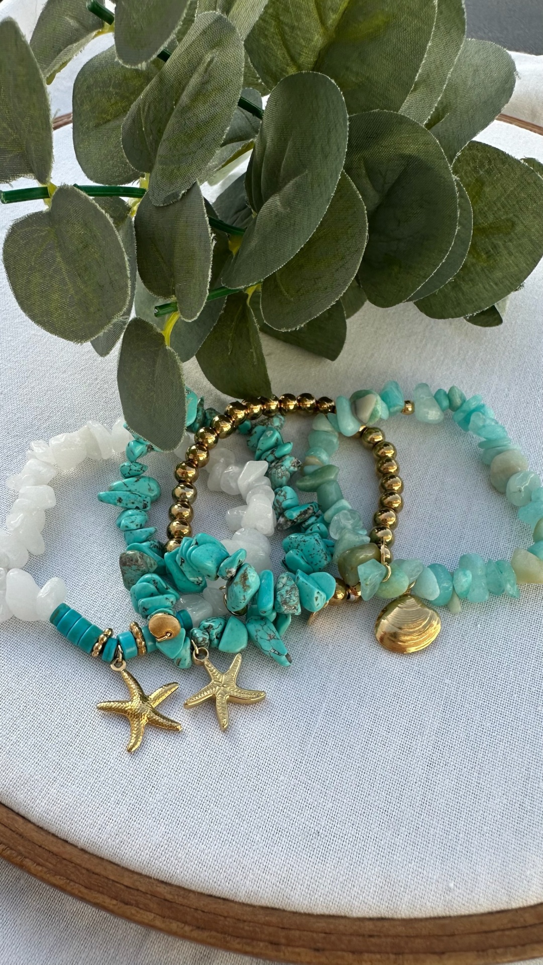 Combinando pedras naturais em tons turquesa, branco e verde-água, bolinhas douradas e pendentes de estrela-do-mar e concha, esta pulseira exala frescor, leveza e boas energias.