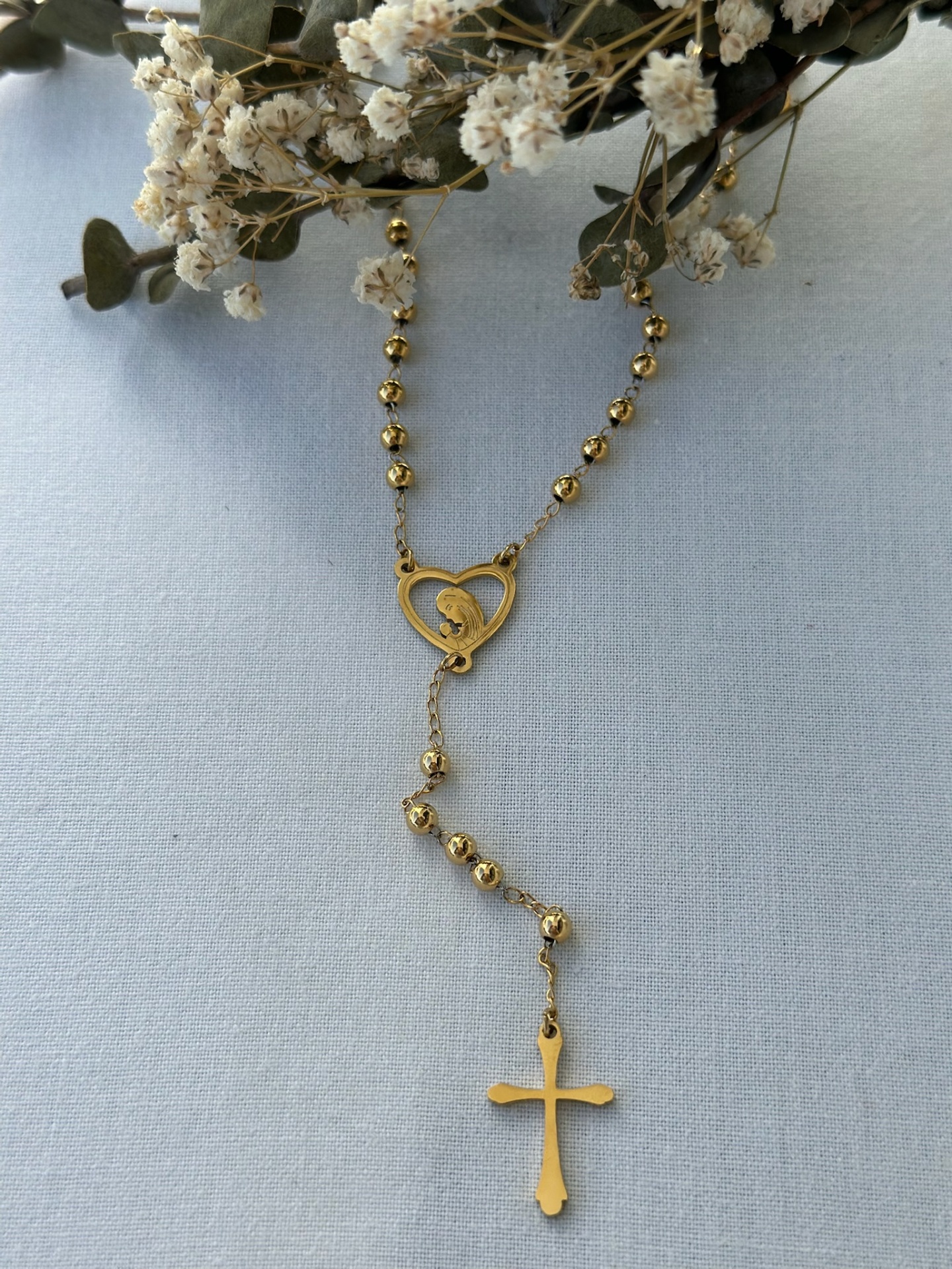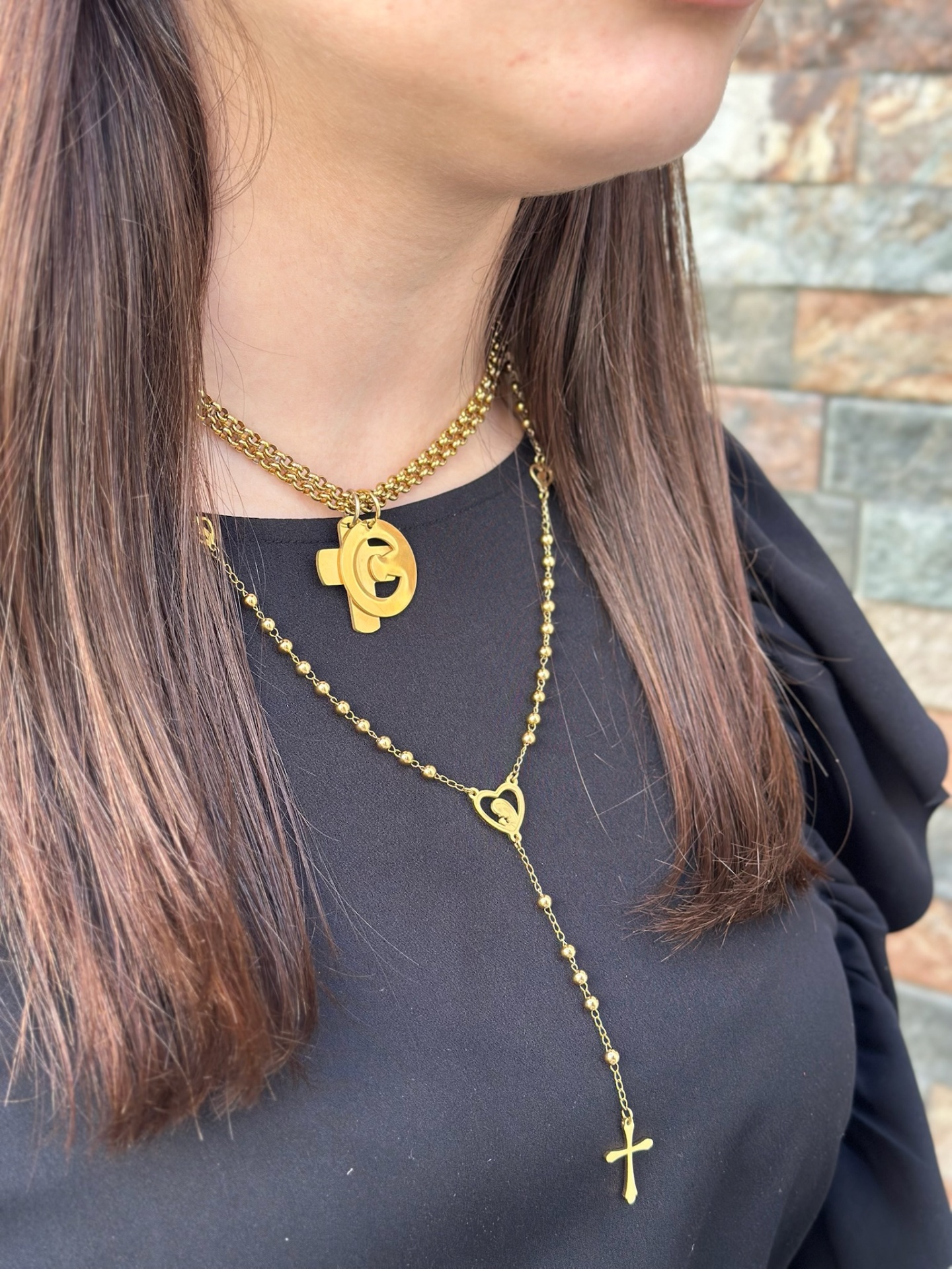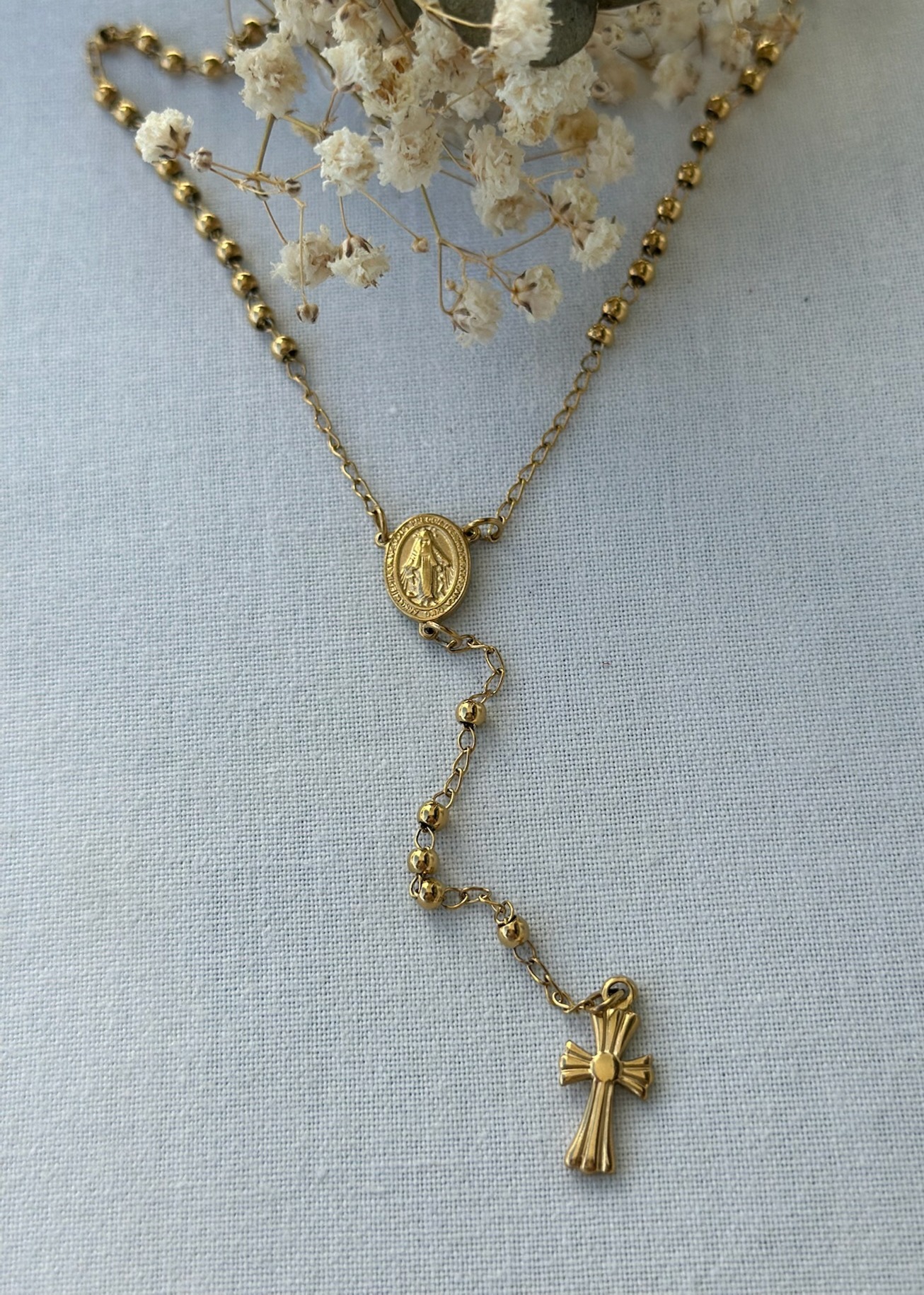 Este fio é mais do que um terço – é aquele toque de luz que faz parte do teu estilo. Em aço dourado, resistente e cheio de detalhe, podes usá-lo no dia a dia como acessório ou como símbolo de proteção e conexão.